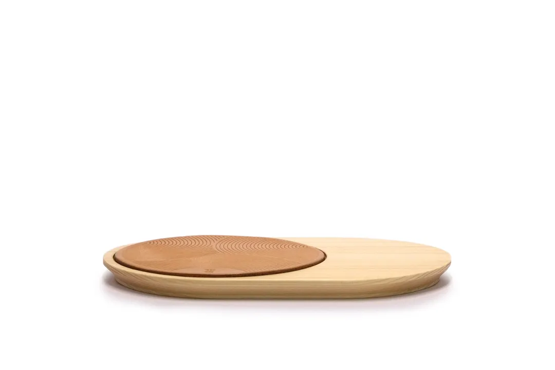 ヒノキの多目的トレイ。地元の多摩産材を高尾の木工で加工された木製品。円型の凹みには PineSkins や皮のコースター(別売、セット商品あり)がぴったりはまります。ウレタンの仕上げにより、日常使いやすいです。