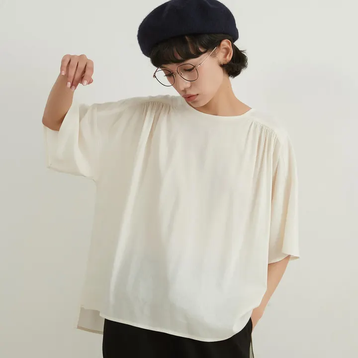 KNNT333リネンコットンギャザー半袖トップシェルボタン付きリボン WHITE/FREE