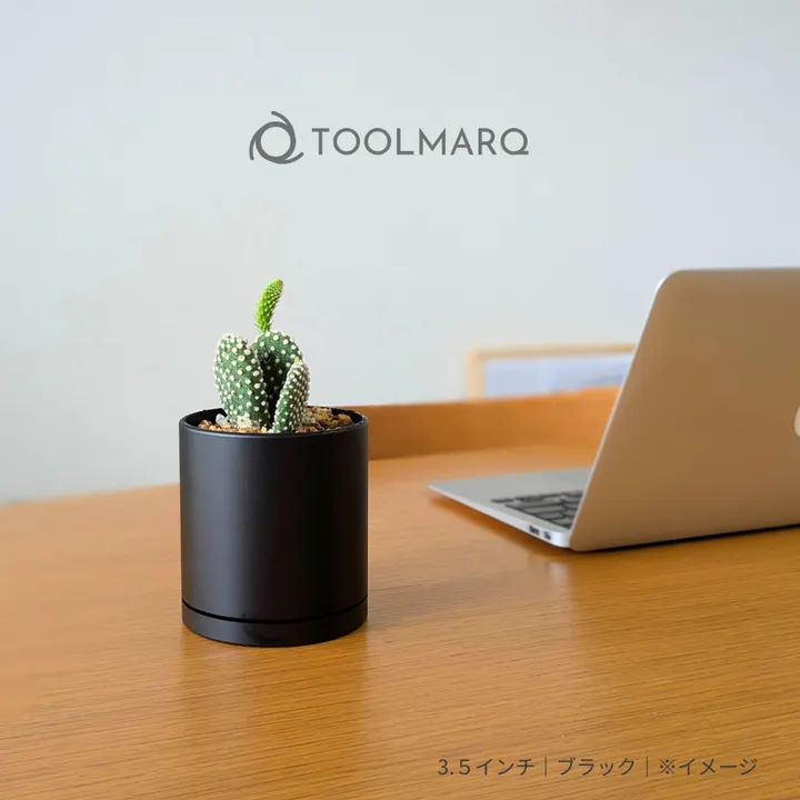 TOOLMARQ 切削アルミ|デスクトップ・プランター BMシリーズ|3.5インチ – ミニ観葉や3号ポットの鉢カバーに最適。暮らしに溶け込むアルミ製プランター – ■商品概要 3号(直径9cm)サイズの観葉植物や多肉植物にぴったりな、無垢アルミ製の室内用プランターです。 鉢カバーとしても、直接植え込む植木鉢としても使える柔軟な設計で、デスクや窓辺、キッチンカウンター、本棚など、限られたスペースにも美しく収まります。 ■この商品が生まれた背景 室内で植物を楽しむ人が増える中、こんな声が多く聞かれるようになりました。 「仕事机に置けるデザインの植木鉢が見つからない」 「鉢は気に入ったけど、その鉢に合う水受け皿がない」 「インテリアのテイストに合う植木鉢がない」 「室内では水受け皿に溜まった水が見えて不潔に感じる」 多くの市販品は屋外向けが前提で、室内使いでは“ちょっとしたストレス”がつきもの。 TOOLMARQは、そんな日常の違和感に着目し、室内での使用に特化した植木鉢・鉢カバーとして開発されました。 ■特徴と機能(5つのこだわりポイント) 1.受皿ごと持ち上げられる、片手で持ち運びできる。 2.鉢底に水の受け皿付き 水を受皿に貯めることができます。 3.机上でずらしやすい 傷がつきにくく、移動がスムース 4.鉢底の通気性を確保 通気性が高く、根腐れを防ぐオリジナル構造 5.土ごと押し上げ可能 底面から押し出して植え替えしやすい ■おすすめの使い方 市販の1〜2号サイズ(直径6cm以下)の育成ポットからの植え替えに最適。 小ぶりなサボテンや多肉植物を入れて、デスク・洗面所・本棚・キッチンカウンターなどに設置すれば、空間にグリーンの彩りと高級感を添えられます。 ■こんな方におすすめ 植物をお部屋にしたいけど清潔感も大切にしたい方 インテリアのテイストと植木鉢のデザインテイストを合わせたい 植物を育てるのが好きな人への贈り物を探している方 植物の植え替えを簡単にしたいと思っている方 ■プロユース(金属製で長期で財貨感が維持できます。) ・カフェ・レストランのオーナーさまShop什器として ・インテリアデザイン会社さま、お客様へのデザイン提案 ・店舗什器/新築物件の内装備品/店舗デザイン案件 ・オフィスユース、会議室や応接ルームの空間の質をUP ・ホテル内装、カウンター、エレベーターホールのグリーン ・SHOPのブランディングアイテムとして