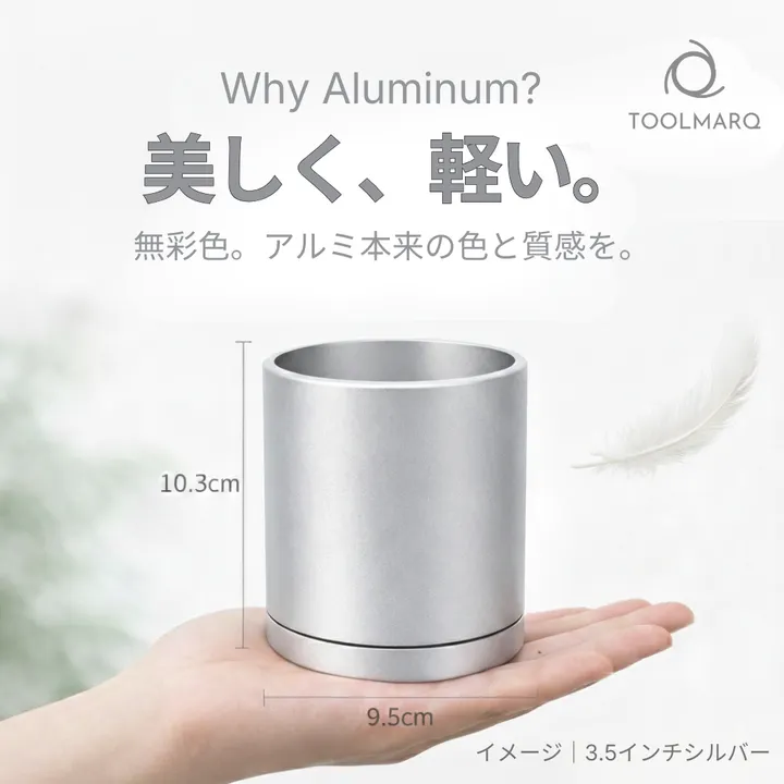 TOOLMARQ 切削アルミ|デスクトップ・プランター BMシリーズ|3.5インチ – ミニ観葉や3号ポットの鉢カバーに最適。暮らしに溶け込むアルミ製プランター – ■商品概要 3号(直径9cm)サイズの観葉植物や多肉植物にぴったりな、無垢アルミ製の室内用プランターです。 鉢カバーとしても、直接植え込む植木鉢としても使える柔軟な設計で、デスクや窓辺、キッチンカウンター、本棚など、限られたスペースにも美しく収まります。 ■この商品が生まれた背景 室内で植物を楽しむ人が増える中、こんな声が多く聞かれるようになりました。 「仕事机に置けるデザインの植木鉢が見つからない」 「鉢は気に入ったけど、その鉢に合う水受け皿がない」 「インテリアのテイストに合う植木鉢がない」 「室内では水受け皿に溜まった水が見えて不潔に感じる」 多くの市販品は屋外向けが前提で、室内使いでは“ちょっとしたストレス”がつきもの。 TOOLMARQは、そんな日常の違和感に着目し、室内での使用に特化した植木鉢・鉢カバーとして開発されました。 ■特徴と機能(5つのこだわりポイント) 1.受皿ごと持ち上げられる、片手で持ち運びできる。 2.鉢底に水の受け皿付き 水を受皿に貯めることができます。 3.机上でずらしやすい 傷がつきにくく、移動がスムース 4.鉢底の通気性を確保 通気性が高く、根腐れを防ぐオリジナル構造 5.土ごと押し上げ可能 底面から押し出して植え替えしやすい ■おすすめの使い方 市販の1〜2号サイズ(直径6cm以下)の育成ポットからの植え替えに最適。 小ぶりなサボテンや多肉植物を入れて、デスク・洗面所・本棚・キッチンカウンターなどに設置すれば、空間にグリーンの彩りと高級感を添えられます。 ■こんな方におすすめ 植物をお部屋にしたいけど清潔感も大切にしたい方 インテリアのテイストと植木鉢のデザインテイストを合わせたい 植物を育てるのが好きな人への贈り物を探している方 植物の植え替えを簡単にしたいと思っている方 ■プロユース(金属製で長期で財貨感が維持できます。) ・カフェ・レストランのオーナーさまShop什器として ・インテリアデザイン会社さま、お客様へのデザイン提案 ・店舗什器/新築物件の内装備品/店舗デザイン案件 ・オフィスユース、会議室や応接ルームの空間の質をUP ・ホテル内装、カウンター、エレベーターホールのグリーン ・SHOPのブランディングアイテムとして