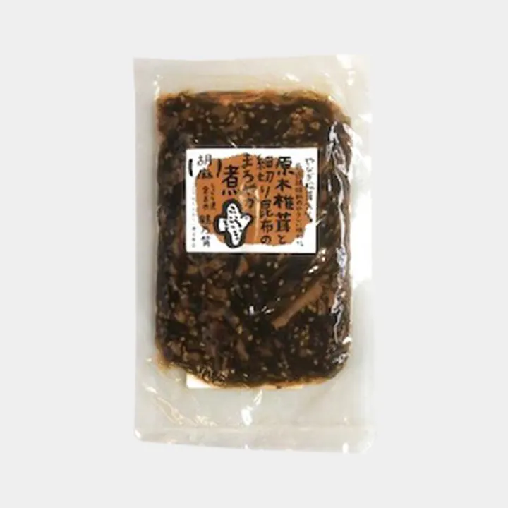 鳥取県産原木椎茸と、鳥取・岡山県の杉材を培地に栽培する無胞子品種のやなぎまつたけを、北海道産昆布と、吟味した本物の調味料でじっくりと煮含めた佃煮です。 やなぎまつたけの心地よい食感と、椎茸の風味、昆布の旨味が調和した一品で、ゴマの風味が食欲をそそります。