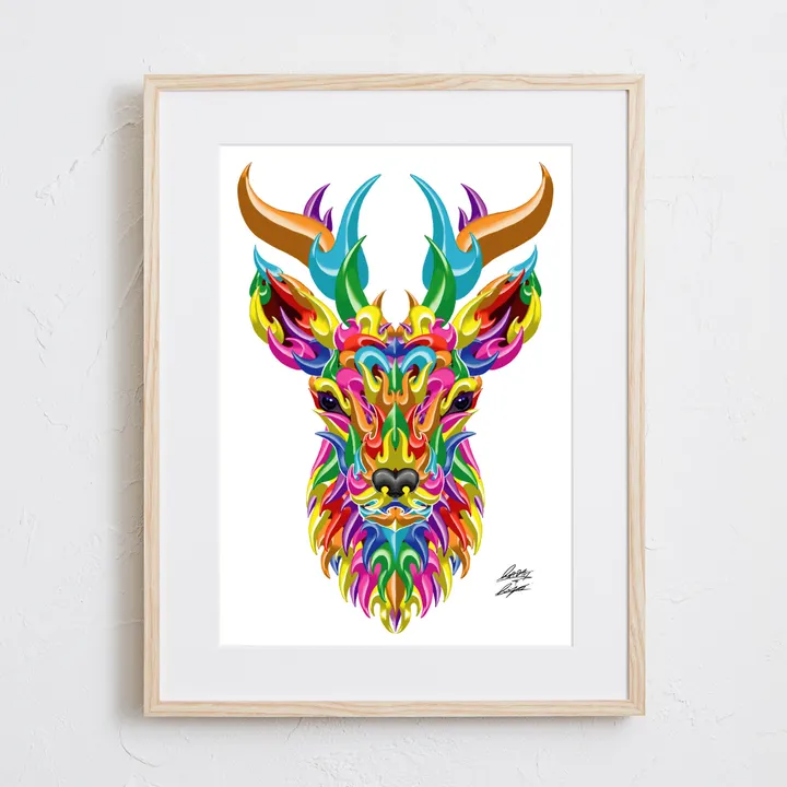 アーティスト -PROFILE- Madblast Hiro(ヒロ) 岐阜県出身。ライブペインター / アーティスト 2021年には大阪府の貝掛中学校の皆様と長さ230mの壁画を制作。 岐阜駅前の繊維問屋街では高さ16mの壁画を制作の他、G-SHOCKやSONY、BETONES等に作品提供を行う。 独自の模様をブロックのように積み上げる表現を突き詰める。 【作品について】 カラフルな色使いはMadblast Hiroの得意とする表現方法の一つ。 配色が美しい、神秘的な動物が印象的。 作品名:Mad Reindeer 手法:イラスト、デジタル ペーパー:高品質半光沢紙 マットカラー:白 マット*:DXホワイト芯 100%バージンパルプ/PH7・中性紙(2mm厚) ※全てのアートにマットがつきます フレームカラー:黒、白、無垢(3種類から選択) ※マット付のため通常とはフレームサイズが異なる規格となります。 【マット*とは?】 アートポスターの周りに挟んだ厚紙の事。 マットを使わない時に比べ余白により広がりが生まれ、作品の新たな一面を引き出せ作品の見栄えがグッと良くなります。また、額縁のガラス面と作品が直接触れたままにしておくと、くっついて作品を傷つけることがあります。マットを使用することでガラスと作品の間に空間ができ、作品を保護することができます。ブランドコンセプトにより全てのアートにマットがつきます。 ー ファッションのようにアートを ー 私達が掲げるコンセプトです! 毎日着替えるファッションの様に、アートも気軽に飾り変えて欲しい... 一旦飾り終えたアートにも光を当ててほしい... ポスター単体、またはリピートで中身だけのポスターを購入された方に"専用のハンガー"をセットでお届け。 「今までに無い!新しいアートの飾り方を提案」 飾る事がなくなった前のアートをハンガーにかけて洋服と一緒にかけてもらう。 その日の気分や、モチベーションですぐに取り換えられる様に。 もちろん、魅せる収納としても今までにないおすすめの飾り方です。