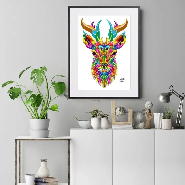 アーティスト -PROFILE- Madblast Hiro(ヒロ) 岐阜県出身。ライブペインター / アーティスト 2021年には大阪府の貝掛中学校の皆様と長さ230mの壁画を制作。 岐阜駅前の繊維問屋街では高さ16mの壁画を制作の他、G-SHOCKやSONY、BETONES等に作品提供を行う。 独自の模様をブロックのように積み上げる表現を突き詰める。 【作品について】 カラフルな色使いはMadblast Hiroの得意とする表現方法の一つ。 配色が美しい、神秘的な動物が印象的。 作品名:Mad Reindeer 手法:イラスト、デジタル ペーパー:高品質半光沢紙 マットカラー:白 マット*:DXホワイト芯 100%バージンパルプ/PH7・中性紙(2mm厚) ※全てのアートにマットがつきます フレームカラー:黒、白、無垢(3種類から選択) ※マット付のため通常とはフレームサイズが異なる規格となります。 【マット*とは?】 アートポスターの周りに挟んだ厚紙の事。 マットを使わない時に比べ余白により広がりが生まれ、作品の新たな一面を引き出せ作品の見栄えがグッと良くなります。また、額縁のガラス面と作品が直接触れたままにしておくと、くっついて作品を傷つけることがあります。マットを使用することでガラスと作品の間に空間ができ、作品を保護することができます。ブランドコンセプトにより全てのアートにマットがつきます。 ー ファッションのようにアートを ー 私達が掲げるコンセプトです! 毎日着替えるファッションの様に、アートも気軽に飾り変えて欲しい... 一旦飾り終えたアートにも光を当ててほしい... ポスター単体、またはリピートで中身だけのポスターを購入された方に"専用のハンガー"をセットでお届け。 「今までに無い!新しいアートの飾り方を提案」 飾る事がなくなった前のアートをハンガーにかけて洋服と一緒にかけてもらう。 その日の気分や、モチベーションですぐに取り換えられる様に。 もちろん、魅せる収納としても今までにないおすすめの飾り方です。