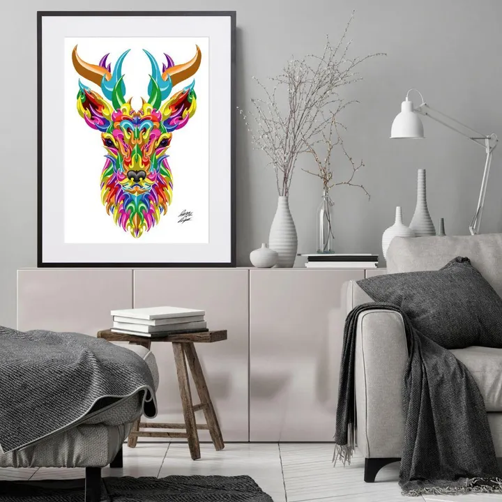 アーティスト -PROFILE- Madblast Hiro(ヒロ) 岐阜県出身。ライブペインター / アーティスト 2021年には大阪府の貝掛中学校の皆様と長さ230mの壁画を制作。 岐阜駅前の繊維問屋街では高さ16mの壁画を制作の他、G-SHOCKやSONY、BETONES等に作品提供を行う。 独自の模様をブロックのように積み上げる表現を突き詰める。 【作品について】 カラフルな色使いはMadblast Hiroの得意とする表現方法の一つ。 配色が美しい、神秘的な動物が印象的。 作品名:Mad Reindeer 手法:イラスト、デジタル ペーパー:高品質半光沢紙 マットカラー:白 マット*:DXホワイト芯 100%バージンパルプ/PH7・中性紙(2mm厚) ※全てのアートにマットがつきます フレームカラー:黒、白、無垢(3種類から選択) ※マット付のため通常とはフレームサイズが異なる規格となります。 【マット*とは?】 アートポスターの周りに挟んだ厚紙の事。 マットを使わない時に比べ余白により広がりが生まれ、作品の新たな一面を引き出せ作品の見栄えがグッと良くなります。また、額縁のガラス面と作品が直接触れたままにしておくと、くっついて作品を傷つけることがあります。マットを使用することでガラスと作品の間に空間ができ、作品を保護することができます。ブランドコンセプトにより全てのアートにマットがつきます。 ー ファッションのようにアートを ー 私達が掲げるコンセプトです! 毎日着替えるファッションの様に、アートも気軽に飾り変えて欲しい... 一旦飾り終えたアートにも光を当ててほしい... ポスター単体、またはリピートで中身だけのポスターを購入された方に"専用のハンガー"をセットでお届け。 「今までに無い!新しいアートの飾り方を提案」 飾る事がなくなった前のアートをハンガーにかけて洋服と一緒にかけてもらう。 その日の気分や、モチベーションですぐに取り換えられる様に。 もちろん、魅せる収納としても今までにないおすすめの飾り方です。