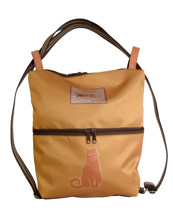 ティピィカレン ワンショルダーリュック2WAYバッグです。 表は光沢のあるオレンジにイラストと切手のキャットモチーフ、裏面は革のような丸のパッチワークをベースにSMILEとキャットをモチーフにデザインしています。 Hoboバッグ風にワンショルダースタイルとリュックスタイルに使い分けて楽しく使ってください。 A4サイズの入る機能的なバッグです。大きな外付きファスナーポケットは収納力もあります。開口部もポケット部分もダブルファスナーで使いやすい仕様になっています。 ポリエステル素材で、光沢感あり、発色がよく、高級感のある素材感が魅力です。 タペストリーやカーテンなどのインテリアファブリックで、生地の厚みや硬さ、強度などが高くバッグとして扱いに適している素材です。撥水ではありませんが水にも強いです。 裏地はコットンで切ポケットを1個つけています。全体の重さは300gでとても軽いバッグです。 素材やパーツなどもこだわり、プリント、縫製もこだわりながら、日本製で丁寧な仕上がりです。 両面の印象が変わるようプリントを変えて、どちらの面を気分で使い分けしたくなる楽しさがティピィカレンバッグの特徴でもあります。 ファブリックバッグの良さを追求し、オリジナルテープを使い、個性的で、高級感もあり、実用的なバッグとして是非お試しください。