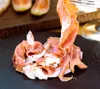 こちらの商品は、生ハムスライスパック50g入りです。 薄くスライスした生ハムを並べ、一段毎に透明シートを挟んでありますので、剥がしやすくなっています。 オリーブ夢豚は香川県の銘柄豚です。 バークシャー(黒豚)と白豚を掛け合わせた、バークシャー50%の三元豚です。 香川県の名産であるオリーブ果実の絞り粕を与え、甘味に富んだ肉に仕上がっています。 バークシャーの血を引き継いでいる為、サシがやや多く、脂肪も美味しい肉です。 当工房の生ハムは、醤油麹菌と白カビの2段階発酵で作られ、その味はうま味が強く、甘いという表現をされています。 それは、当工房の標準品であるオリーブ夢豚の生ハムを食べた方々の評価です。 うま味や脂肪のバランスが良く、特に脂肪はチーズの様な風味を持っています。