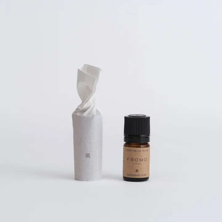 【エッセンシャル オイル 風 (オキナワン ハーブ)】 気持ちがやわらぐ涼やかな香り シダーウッド、ローズマリー、ハッカ、レモングラスなどをブレンド。吹きぬける風のように、緊張をときほぐし、すっきりとした気分に。 FROMOのエッセンシャルオイルは、花や葉、果実、木など、植物から抽出した天然の100%ピュアオイルです。植物のピュアな香りは、心にはたらきかけ、日頃のストレスや緊張をほぐし、からだのバランスを整えてくれる作用があります。 *船便での発送のため、沖縄県外はお届けに約1週間かかります。 ● 使い方 ・ディフューザー、アロマポット、アロマストーンなどに、適量(数滴)垂らして、香りを拡散させてお楽しみください。 ・市販のキャリアオイル(精油を希釈するための植物油)に1%未満まぜて、マッサージオイルとしても使用いただけます。(肌に合わないときは、使用をご遠慮ください) ・使用後は、必ずキャップをしっかりと閉めてください。 ・必ずビンを立てた状態で、保管してください。 ・酸化を防ぐため、温度変化が少なく、直射日光の当たらない場所で保管してください。 ・開封後は、1年以内を目安にお使いください。(成分変化が起こりやすいものもありますので、使用時は必ず香りを確認してください) ● おすすめの使用シーン ・お部屋の芳香に、香りを拡散させてお楽しみください。 ・キャリアオイルと混ぜて、ボディマッサージに ● こんな方におすすめ 気持ちをさわやかにリフレッシュしたい方