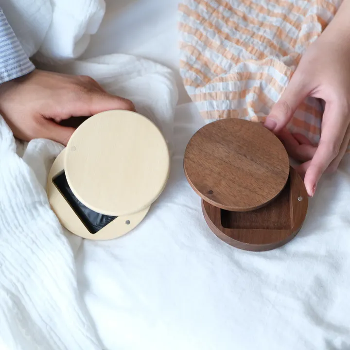 直径9cm・高さ1.9cm ・ヒバ:蓋に角なし ・ウォールナット:蓋に角あり ※掲載写真にサイズ画像(ウォールナット版)がございますので、ご確認ください。 ※蓋の様子は、掲載写真をご覧ください。