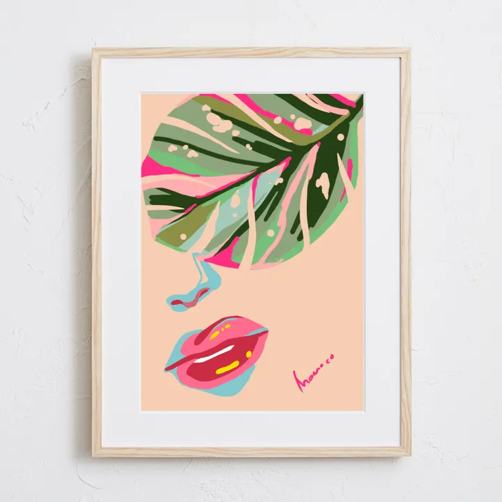 【現代アートポスター】ボタニカル 観葉植物 唇 Lip 女性 イラスト A4(S) フレームセット:無垢 30.4×39.4cm