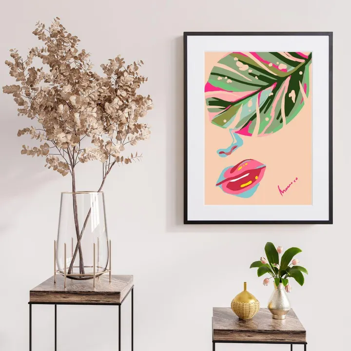 アーティスト -PROFILE- MOMOCO(モモコ) 「色」をこよなく愛する画家、ライブペインター。 躍動感あるアートにも関わらず、服を一切汚さず短時間で音楽と同時に描き上げる。そのパフォーマンスと巨大アートは観る人を魅了する。 前職は某有名ファッションブランドにてデザイナーとして活躍。その経験の中で養われた「色とデザイン」の絶妙なバランスを活かしつつ、トレンドを取り入れ進化し続けるアートを目指す!国内外問わず、精力的にアートと向き合い発信を続けている。 【作品について】 ピンク色がアクセントになった葉っぱに女性の唇が ポップな色使いとどこか切なさも感じさせるおしゃれなアート ナチュラルな部屋、モダンなインテリアにも相性が良い作品 作品名:思い出の記憶 手法:デジタル、イラスト ペーパー:高品質半光沢紙 マットカラー:白 マット*:DXホワイト芯 100%バージンパルプ/PH7・中性紙(2mm厚) ※全てのアートにマットがつきます フレームカラー:黒、白、無垢(3種類から選択) ※マット付のため通常とはフレームサイズが異なる規格となります。 【マット*とは?】 アートポスターの周りに挟んだ厚紙の事。 マットを使わない時に比べ余白により広がりが生まれ、作品の新たな一面を引き出せ作品の見栄えがグッと良くなります。また、額縁のガラス面と作品が直接触れたままにしておくと、くっついて作品を傷つけることがあります。マットを使用することでガラスと作品の間に空間ができ、作品を保護することができます。ブランドコンセプトにより全てのアートにマットがつきます。 ー ファッションのようにアートを ー 私達が掲げるコンセプトです! 毎日着替えるファッションの様に、アートも気軽に飾り変えて欲しい... 一旦飾り終えたアートにも光を当ててほしい... ポスター単体、またはリピートで中身だけのポスターを購入された方に"専用のハンガー"をセットでお届け。 「今までに無い!新しいアートの飾り方を提案」 飾る事がなくなった前のアートをハンガーにかけて洋服と一緒にかけてもらう。 その日の気分や、モチベーションですぐに取り換えられる様に。 もちろん、魅せる収納としても今までにないおすすめの飾り方です。