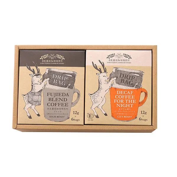 『奈良藤枝珈琲焙煎所』のオリジナルギフト ドリップバッグコーヒーのギフトセットです。本格的な味や香りを楽しめる自家焙煎珈琲を専用のギフトBOXでお届けします。 ギフトBOXサイズ:高さ90mm、幅260mm、奥行155mm