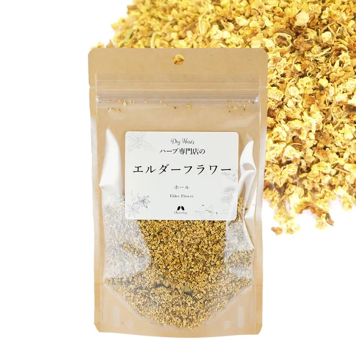 エルダー(セイヨウニワトコ)の花のお茶です。 ヨーロッパでは古くから、このエルダーを使ってシロップを作っていました。 エルダーは花から実まで利用でき、『万能の薬箱』と呼ばれています。 マスカットの香りがします。 ミントや紅茶、クローブやシナモンとのブレンドがおすすめ。 風味豊かなハーブティーとして、お楽しみ頂けます。 英名 Elder Flower, Whole 学名 Sambucus nigra 科名 スイカズラ科 部位 花 別名 セイヨウニワトコ 原産国 ポーランド ※原産国は 気候やその他の要因になり、予告なしに変更する場合があります。