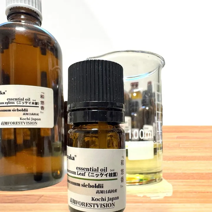 和悠香 ニッケイリーフ精油5ml高知日高村産 高知県日高村産 ニッケイ枝葉 精油5ml 送料無料。 希少なニッケイ 高知県日高村、清流仁淀川に注ぐ山水と、温暖な気候に育まれた自生するニッケイ(肉桂)の枝葉から 抽出した、精油です。 ニッケイは、シナモンとして広く知られ、表皮や根、葉っぱなどそれぞれに特徴的な香りを保ち、時なスパイスとしての活躍などにもされています。 ニッキとして、八つ橋などへの活用や子供の頃駄菓子屋さんにあったニッキの飲料や飴など懐かしさも感じます。 抽出部位 枝葉 学名:Cinnamomum sieboldii 抽出方法 水蒸気蒸留法 主な成分 オイゲノール、酢酸オイゲニル、β-カリオフィレン、リナロール、シンナムアルデヒド(桂皮アルデヒド)など オイゲノールの優れた抗菌作用・抗ウイルス作用が期待される他、お腹のサポートにも活用されています。 至福の空間に包まれ、心身をリフレッシュさせ、ストレス軽減にも効果的。また、リラックスした環境を作り出し、心を安定させる効果もあります。
