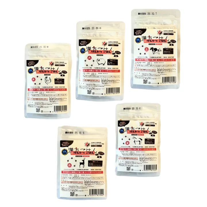 【木】鶏肉、有機オーツ麦、玄米、押麦、鶏レバー、黒大豆粉、里芋、きゃべつ、セロリ、トマトピューレ、にんじん、ビール酵母、クコの実、山査子、五加皮、陳皮、オリゴ糖、卵殻カルシウム、大豆レシチン、こんにゃく粉、干し椎茸、ひじき、ごま油、ミネラル(リン酸ナトリウム、グルコン酸亜鉛、グルコン酸銅、マンガン酵母、セレン酵母)、ビタミンD,ビタミンE酸化防止剤:アスコルビン酸(ビタミンC) 【火】羊肉、有機オーツ麦、豚ハツ、きび、押麦、小豆粉、豚レバー、にんじん、じゃがいも、きゅうり、マッシュルーム、ビール酵母、えごま油、れんこん、なつめ、オリゴ糖、卵殻カルシウム、大豆レシチン、こんにゃく粉、粉末昆布、シナモン、ミネラル(リン酸ナトリウム、グルコン酸亜鉛、グルコン酸銅、マンガン酵母、セレン酵母)、ビタミンD、ビタミンE酸化防止剤:アスコルビン酸(ビタミンC) 【土】牛肉、有機オーツ麦、米、ひえ、大豆粉、豚レバー、豚脂身、かぼちゃ、さつまいも、里芋、きゃべつ、大根、にんじん、えのき茸、なつめ、オリゴ糖、ビール酵母、山査子、卵殻カルシウム、オリーブオイル、大豆レシチン、こんにゃく粉、粉末昆布、ミネラル(リン酸ナトリウム、グルコン酸亜鉛、グルコン酸銅、マンガン酵母、セレン酵母)、ビタミンD、ビタミンE酸化防止剤:アスコルビン酸(ビタミンC) 【金】馬肉、有機オーツ麦、米、豚レバー、大豆粉、豚脂身、ハト麦、長芋、じゃがいも、きゃべつ、大根、にんじん、オリゴ糖、ビール酵母、白すりごま、オリーブオイル、卵殻カルシウム、大豆レシチン、陳皮、なつめ、こんにゃく粉、粉末昆布、ミネラル(リン酸ナトリウム、グルコン酸亜鉛、グルコン酸銅、マンガン酵母、セレン酵母)、ビタミンD、ビタミンE、酸化防止剤:アスコルビン酸(ビタミンC) 【水】鹿肉、有機オーツ麦、米、豚レバー、豚脂身、黒大豆粉、さつまいも、長芋、きゃべつ、ブロッコリー、にんじん、オリゴ糖、ぶなしめじ、黒すりごま、五加皮、卵殻カルシウム、ビール酵母、大豆レシチン、なつめ、ごま油、こんにゃく粉、ひじき、ミネラル(リン酸ナトリウム、グルコン酸亜鉛、グルコン酸銅、マンガン酵母、セレン酵母)、ビタミンD、ビタミンE、酸化防止剤:アスコルビン酸(ビタミンC)