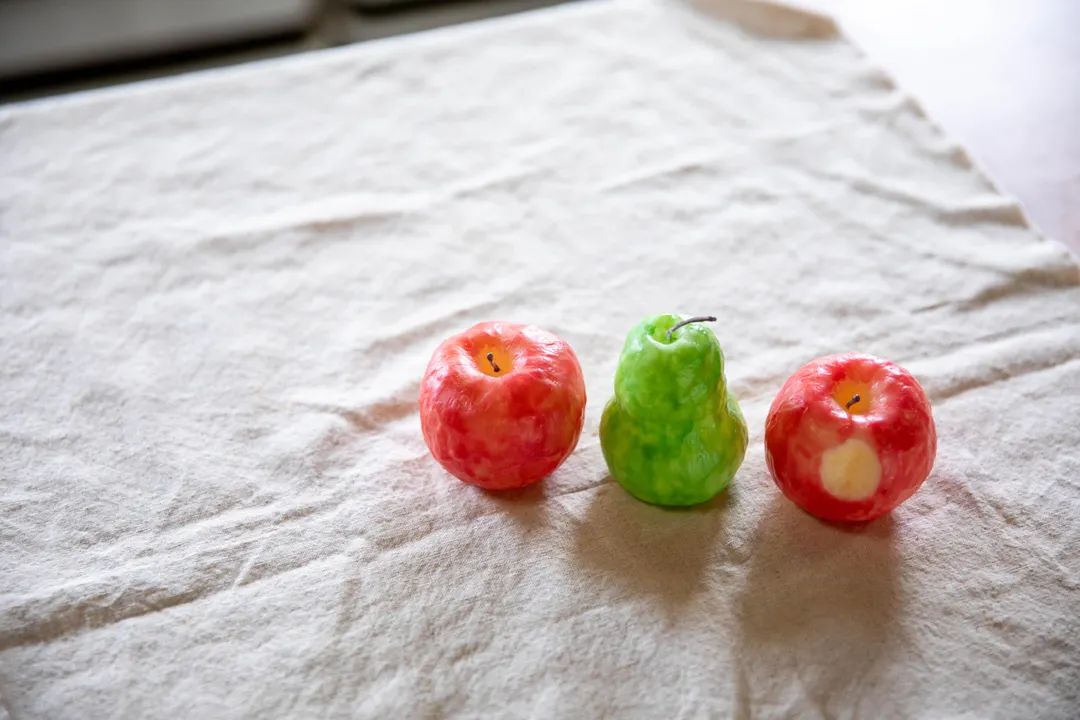 りんごの形をそのまま表現した果物のキャンドルです まるっとそのまんまのりんごと かじりかけのりんごの、2種類からお選びいただけます 大きさは、少し大きめの姫りんごくらいです ロウにがほのかにりんごの香りをつけています 真っ赤でまんまるなその造形は、置いておくだけでもとても可愛いです 灯した炎は、点いた瞬間は一度小さく、その後すぐに大きく膨らみ 辺りを温かく、儚いヒカリで照らします そんな灯りをどうぞご堪能ください ———————— material:パラフィンワックス、マイクロワックス、香料、綿芯 fragrance:りんごの香り 燃焼時間:約6H(気温・空調・環境により異なる) ———————— ・・・・・・・・・・・・・・・・・・・・・・・・・・ 『ひいらぎキャンドルの〈designed〉』 「デザイン」に焦点を当てた、 初心者さんにもおすすめの遊び心のあるキャンドル カラフルな色使いのキャンドル 徹底的にシンプルにこだわったキャンドル ひいらぎキャンドルの『designed』シリーズは、 「デザイン」にこだわったキャンドルです 色遊びをしたり、モチーフ遊びをしてみたり 個性的なフォルムのキャンドルが出来上がり! もちろん、灯りの美しさも計算した作りで インテリアとしてだけでなく、是非そのヒカリを楽しんでください ・・・・・・・・・・・・・・・・・・・・・・・・・・ ひいらぎキャンドルでは、 キャンドルは一点一点全て手作業で作成しています。 キャンドル本体の製作だけでなく、ラベルやパッケージのデザイン、シールの貼り付け、 梱包など、キャンドルが生まれるところから旅立つまでの間の全ての制作作業を 自身で行なっております。 【ご注意点】 <こちらの商品は受注生産になります> ・香りの良い新鮮なものをお届けする為、注文を頂いてからお作りしています ・1つ1つ丁寧に作成しておりますがハンドメイドの為に画像と同じ作品は作れません 手作業のため大きさに多少の誤差・お色味や形状が若干異なる場合がございます ・お客様よりご注文を頂いてから、すぐに製作に入らせて頂きます 途中でのデザインや素材など一切の変更、製作のキャンセルはお受けすることが出来ません ・注文日より1週間以内に発送しておりますが、 お急ぎの方・ご希望納期のある方は必ず事前にお知らせ下さい。 配送地域、交通事情、素材の在庫等の理由により遅延する場合がございます お届けまでに2週間ほどかかる場合もございます どうぞ余裕を持ってご購入くださいませ ○火を取り扱う製品となります。 「attention」という注意事項を同封致しますので、 必ずお読みいただきご使用下さいますよう宜しくお願いいたします。 ※当店のキャンドルをご使用の上で起きた事故についての責任は負いかねます※ 予めご了承ください
