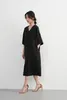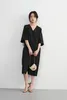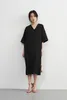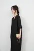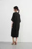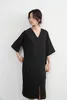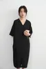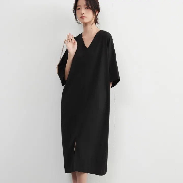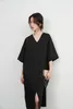KNXO531・シンプルエレガント・Vネック半袖ワンピース・ワイドスリーブドレス・ミニマムstyle・裾スリットHライン体型カバー 8月中旬入荷BLACK/FREE