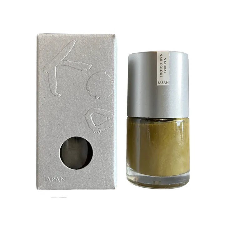 日本暮らしを彩る古代の色、土から取れるベンガラの色そのままをネイルにしました。 土そのものの色であるベンガラは肌にやさしいだけでなく、たとえば焼き物を作るときにかんじるような、 農作業で土をさわるときに感じるような、あったかい安心するような、癒しのエネルギーをもっていると言われています。 ベンガラは焼く温度(酸化)によって粒の形が変形し、その変化がさまざまな色をうみだします。 古くから日本画、能面、神社仏閣の壁画、天井画などの白色、または下塗り剤として使用されてきた胡粉(ホタテ貝殻の粉) を配合し、べんがらの色をより美しく引き立てるとともに、豊富に含むカルシウム、マグネシウム、亜鉛などのミネラルが 爪を保護、保湿し、美しく健康に保ちます。 原料はベンガラ、胡粉、天然ゴム、食品添加物である増粘剤とアクリル、ポリウレタンを使用した有機溶剤フリーの水性。 一部を除いて、ほとんどが天然素材というネイルの概念をくつがえす、安心安全、自然の美しさを生かしたネイルです。 通常のネイルに用いられる有機溶剤による強いにおいや、爪への負担もありません。 古代ネイルは内容成分の多くが安全な天然素材でできているため、通常のネイルと比較してとれやすくできています。 One Dayネイルとして、痛んだ爪をやすめるときや、お子様のネイルとして、またペディキュアにも適しています。 ネイルは専用のネイルリムーバーか、消毒用のエタノール75%以上のもので、コットンに含ませて落としてください。 除光液を使用することなくネイルを落とすことができますので、爪への負担を軽減します。 ・水性で自然素材でできていますので、ネイルをご使用の際は、爪表面の汚れや油分を落としてからハケに適量取って、のばすように塗ることで美しく仕上がります。 ・2度塗りするとさらにきれいに発色します。 ・マットな質感のため、トップコートを塗ることで艶が出て長持ちします。 ・べんがらの色をより長くおたのしみいただきたい方には、市販のトップコートの重ね塗りをおすすめいたします。 ・乾くまで一般的なネイルと同等の時間がかかります。 ・真珠貝の核(ボール状)がボトルの中に入っております。よく振ってからご使用ください。 ・お風呂などの水分によりネイル塗料が浮いてきますので、爪の根元からピーリングの要領で剥がすときれいに取れます。 ・エフェクト#01は大きな粒子のラメ、エフェクト#02は大きな粒子のラメのトップコートです。10色のカラーと組み合わせることで、異なる表情をお楽しみいただけます。 カラー原料:アクリル酸アルキルコポリマー・ポリウレタン-34・水・ホタテ貝殻の粉・酸化鉄(べんがら)・酸化チタン・ゴムラテックス・セルロースガム カラー:#くさみどり