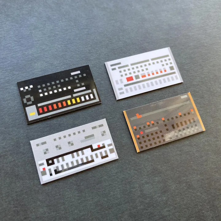 リズムマシンのドットデザインミニマグネットです。 ドットでアイコン風にかわいく仕上げました。 リズムマシン、ベースシンセをイメージした4種のセットです。 眺めているとリズムマシンが触りたくなってくるかも♪ 好評のマグネットSKMシリーズと一緒に使ってもGood◎です。 マグネットなのでカレンダーのSKM-365パネルにもくっつきます!(画像参照) 一緒に使うと盛り上がりそうです。 冷蔵庫はもちろんオフィスのスチールロッカーにも。 ミニサイズなのでちょっとした狭い場所にもくっつきます。 スチール棚の枠なんかにもくっつきます。 小さい鉄製のものにくっついてくれます。 こっそりシンセ好きをアピールするのにいいかもですね。 シンセ好きが反応するかもしれません♪ <シンセサイザードットマグネット02 リズムマシン 商品内容・仕様> 4種×各1枚入 合計4枚入 本体:マグネット 1:Analog RhythmMachine(左上)SIZE:29×17mm 2:Bass SYNTHESIZER(左下)SIZE:29×16mm 3:PCM +Analog RhythmMachine(右上)SIZE:29×17mm 4:PCM RhythmMachine(右上)SIZE:29×17mm 厚み:4種全て約0.6mm ※加工の際に表面に若干加工傷が付きますのでご了承ください。 ※ミニサイズです。磁力は弱めです。飾り用マグネットだと思ってください。 強力な磁力をお求めな方はラバータイプやSKMシリーズをご利用ください。