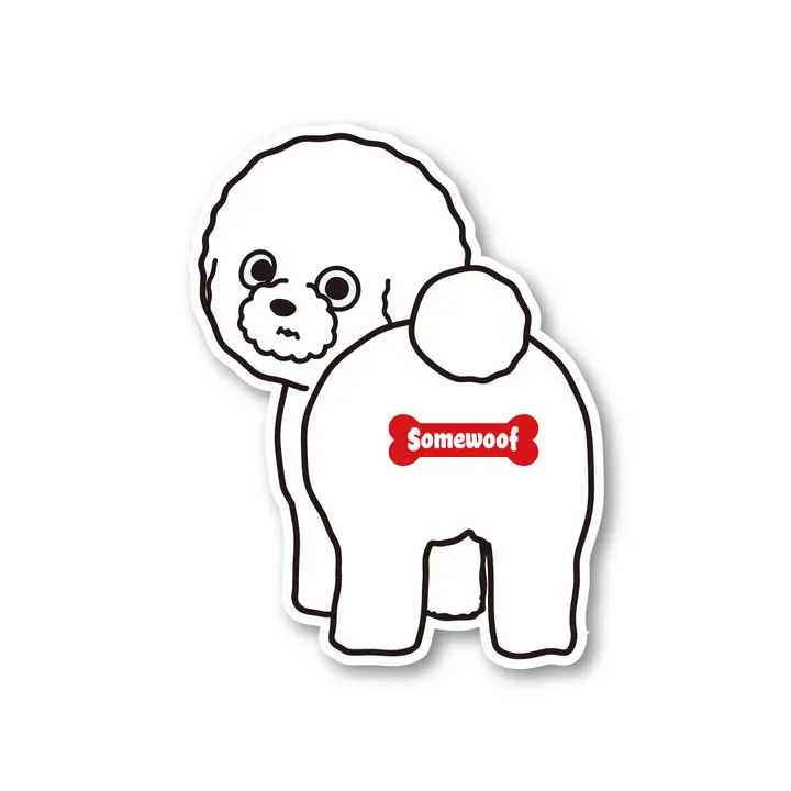 大人気のSomewoofオリジナルのビションフリーゼのステッカーの単品販売です。 人気イラストレーター hoppeさん描き下ろしの犬種イラストのお尻にSomewoofのロゴが入ったかわいらしいステッカーをオンラインでも発売します! サイズ:W53m×H69mm 仕様:屋内用 材質:ミラーコート
