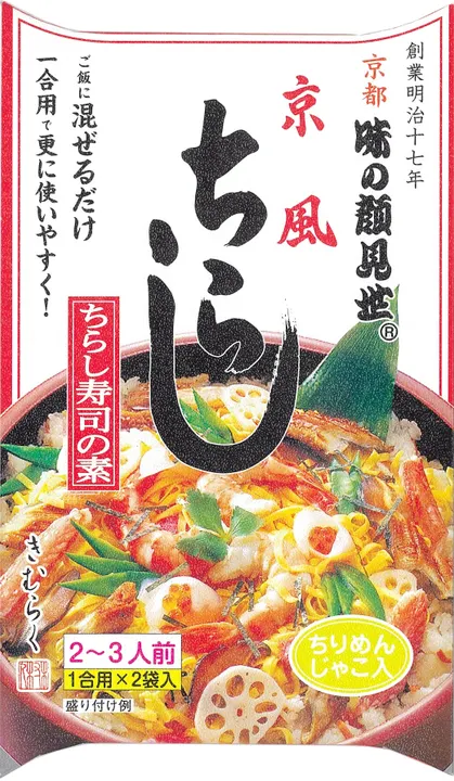 「京風ちらし寿司の素」は炊きたてご飯に混ぜるだけで、本格的な京都の味手軽に堪能できます。柚子や湯葉などバリエーションもあり贈り物としても一層人気を博しています。