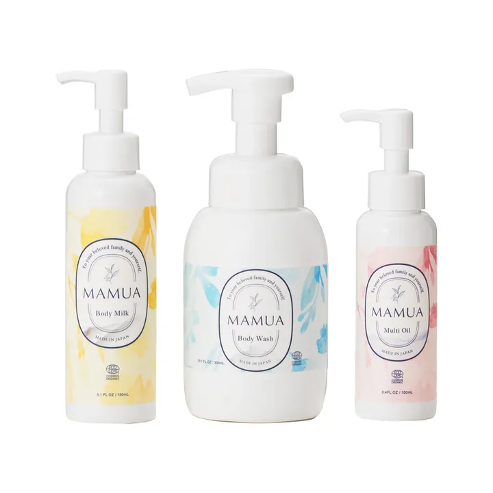 MAMUAの商品をお試しになりたい方へおすすめ! 初回限定50%OFF 泡ボディウォッシュ 300ml と ボディミルク 150ml と マルチオイル 100 ml のセット3本商品です。 ------------------------------------------------------------------------------------------------------------ 季節の変わり目秋の肌ケアに、国産オーガニックのやさしさを。 COSMOSオーガニック認証取得・無添加処方で叶える、全身トータルケア。 夏の強い紫外線や冷房でダメージを受けた肌は、秋になると乾燥や気温差によるゆらぎを感じやすくなります。 MAMUA(マムア)のボディケアセットは、そんな季節の変わり目の肌をやさしく包み込み、敏感肌の方でも安心して使えるシンプル処方で、全身のうるおいを保ちます。 ■ 泡ボディウォッシュ(300mL) 植物由来の洗浄成分で、肌のうるおいを守りながらやさしく洗浄。ふんわりきめ細かい泡で、汗や汚れをしっかりオフしつつ、乾燥を防ぎます。デリケートゾーンにも使用可能。 ■ ボディミルク(150mL) 肌にスッと浸透する軽やかなテクスチャーで、乾燥によるかゆみや赤みを抑えながら、長時間うるおいをキープ。ホホバオイルをメインに保湿成分を贅沢に配合。 ■ マルチオイル(100mL) 1本で髪・身体・ネイル・デリケートゾーンにも使える高保湿オイル。天然精油100%の香りが心をほぐし、夏の疲れを癒します。ベタつきのない使用感で、朝晩問わず活躍。 いずれもCOSMOS ORGANIC認証取得の国産処方。合成香料・着色料・パラベン・シリコン・石油由来原料を使用しない #クリーンビューティー設計 です。 肌トラブルが起きやすいこの季節だからこそ、シンプルで確かなケアを毎日の習慣に。 自然の力で肌本来のうるおいバリアを整え、素肌力を高めてくれるMAMUAのケアをぜひご体感ください。 ----------------------------------------------------------------------------------------------------------------- MAMUAは、優しいカラーとデザインにも定評があり、出産祝いのギフトとしても 喜ばれています。 おすすめのギフトセットは下記の通りです。 お客様のニーズに合わせて、店舗様でギフトセットを販売できます。 ・出産祝いギフト3本セット ・出産祝いギフト2本セット ・出産準備・フェムケアギフト2本セット ・保湿ケアギフト2本セット MAMUAの製品を敏感肌で3世代でご利用になられる方もいらっしゃいます。 赤ちゃんから大人・お年寄りまで幅広い世代に喜ばれています! 「母の日」「父の日」「誕生日」「クリスマス」ギフトとしてもおすすめです。 <泡ボディウォッシュ> 泡ボディウオッシュは、初めてご利用になられた方で他社との違いが 洗い上がりに保湿力で分かる製品です。 洗顔、ボディ、デリケートゾーンの洗浄にお使いいただけます。赤ちゃんと一緒のバスタイムに。 敏感肌の男性は、シェイバー用のソープとしてもおすすめです。 また、介護用にも優しいソープでおすすめです。 自分の親にはいいものを使用していただきたい方がリピートで購入しています。 <ボディミルク> 赤ちゃんの繊細なお肌を考えて選ばれた成分と処方で新生児の保湿ケアはもちろん、 お顔も含めて全身にご利用いただけるので、女性から男性までご家族でご利用いただけます。 みずみずしいテキスチャーですっと肌になじむので季節を問わずに心地よく使えます。 また、1本(150mL)を家族で使えるので家族旅行のお供してもちょうどいいサイズです。 沖縄旅行やリゾートでの肌ケアにかかせないアイテムです。 少量で伸びがが良く、べとつかないのですぐに洋服が着れると子供から高校生まで人気です!特に男子。 女性からは、ベタつかない後肌だから日中の保湿ケアとして、家事や仕事の後のハンドケアとして 人気です! <マルチオイル> 妊婦さんも使用できる優しいマルチオイル。 ザクロオイルやタマヌオイルなど希少なオーガニックオイルやエキスを保湿成分として配合した 美容液のように軽やかなオイルは、乾燥から肌を守り、うるおいとハリを与えます。 年代を問わず、幅広い世代で、天然由来100%をブレンドした、 呼吸したくなるようなリフレッシュする香りが人気です。