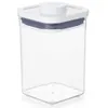 "魅せる収納"で人気のポップコンテナ フタの真ん中についているボタンを押すだけで開閉ができ、ポップアップしたボタンはそのままハンドルとして使えるドライフード用の保存容器です。調理中や、片手がふさがっていても、ワンタッチ操作で密閉が可能です。 フタの形はミニスクエア、スモールスクエア、ビッグスクエア、スリムレクタングル、レクタングルの5種類。高さは小さいほうから順にミニ、ショート、ミディアム、トールの4種類です。 高さはミニを基準にミニの2倍がショート、3倍がミディアム、4倍がトールと全てのフタの形に共通しているので、カウンターや戸棚の中でスッキリ整理整頓ができます。サイズ違いでもきれいにスタッキング(積み重ねて収納)ができます。 スクエア形状の容器は省スペースで収納できるだけでなく、掴みやすく、角から中身を注ぎやすいのも特徴です。毎日使うものだからこそ、使い勝手の良さを追求した保存容器です。 また、ポップコンテナに合わせてお使いいただける各種アクセサリーもあります(別売り)。フタの裏に装着して収納できるので、別にスプーンを用意したり、コンテナの中で埋まって見えなくなってしまうこともありません。 ポップコンテナは全部で18サイズありますので、入れるものの量や形にあわせてお選びください。フタは内側のパーツを取り外してお手入れが可能です。ボタンのついているフタ以外は漂白剤がご使用いただけます。すべてのパーツは食器洗い乾燥機(低温設定)がご使用いただけます。 適合アクセサリータイプ: ポップスクープ / コーヒースクープ / 粉ふるいスクープ / ライスカップ / シュガーキーパー