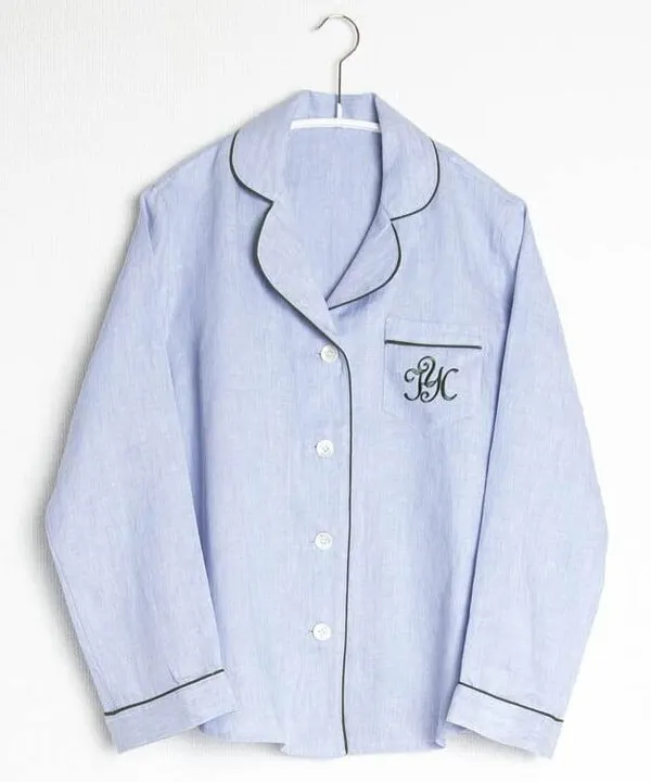 近江湖東地域で織られた爽やかなブルーのダンガリー60番手の高級リネン。 薄手でふんわりと軽く、着るほどに肌触りがガーゼのようになります。 パジャマは薄手が好みという方にピッタリで、通年着用いただけます。 カーキ色のパイピングテープと同色の胸ポケットの刺繍がアクセントになっています。 身頃脇、袖、アームホール、パンツなど、すべての縫い合わせは折り伏せ縫いになっているので、ひっかかりやほつれの心配がありません。 パジャマのパンツには両サイドにポケットがついていて、便利です。 ブランドタグは首元を避けて、前身頃の下にさりげなくつけました。 パンツのヒモは後ろセンターで縫い付けているのでお洗濯の際の偏りは起こりません。 すべてのパジャマに、同素材の袋(約H34×W30)が付いているので、ご旅行にも便利です。 お洗濯ではタンブラー乾燥はお避け下さい。 アイロンをかけるとリネンのツヤとハリが戻ります。 生地の特質上若干縮みますので、サイズ選びはご考慮ください。 今夏よりレディースのみLLサイズをプラスしました!