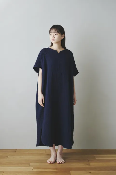 3重ガーゼでできたワンピースです。 パジャマ、部屋着、お風呂上がり、台所で、さまざまにお使いいただけるルームウェアとして、ちょっとそこまでお出かけするワンマイルウェアとして、日常生活の多くの場面において活躍してくれるワンピースをつくりました。 夏はこれ1枚ですずしく、秋冬は重ね着コーデであったかくお召しになれます。 部屋干しでも乾きやすいので、それほどたくさんの洗い替えも必要ありません。 いつもどおりのお洗濯方法で遠慮なく洗えます。 シワも気になりづらい生地なので、ぜひ気兼ねなくいろんなシーンでお使いください。 身幅は同じ、身丈だけがサイズ違いで、SとMがあります。身長やお好みの丈感に合わせてお選びください。 マタニティの方などにもオススメです。抱っこされているお子さんにとっても、気持ちのいい肌触りです。