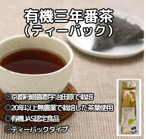 「有機三年番茶 ティーパック 8g×20パック」は京都府綴喜郡宇治田原の霧深い山間部の茶畑で20年以上無農薬で栽培した茶葉を使用した番茶です。 しっかり成長したお茶の葉と茎棒と呼ばれる太い茎を摘み取り、蒸してから乾燥させ、専用の室の中で熟成させた後、葉と茎に分けて専用の釜で充分に焙じあげ、程よく混ぜ合わせて仕上げました。 ご家族みなさんでお楽しみください。手軽に楽しめるティーパックタイプ。 有機JAS認定食品。