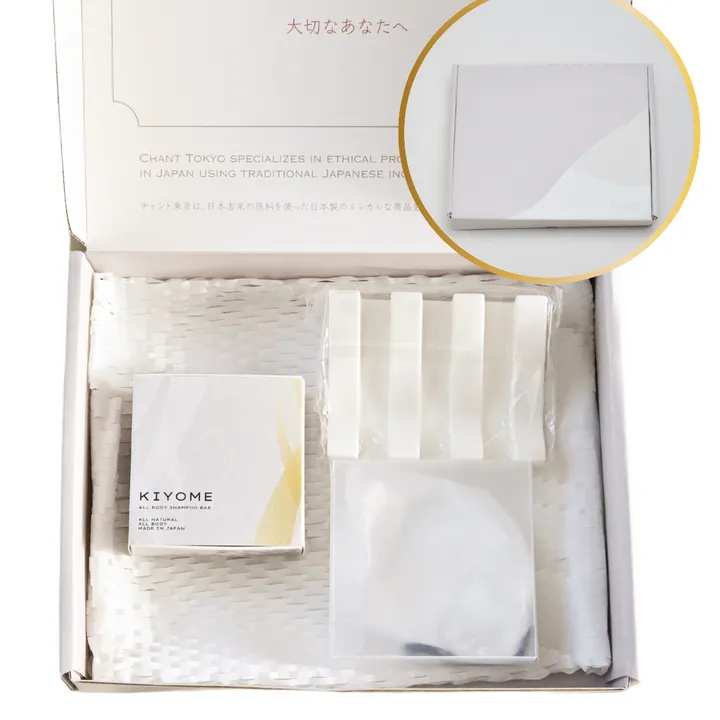 これ1つで浴室には他に何もいらない!全身シャンプーバーのスターターセット オリジナルボックス入りでギフトにもおすすめです。 <内容> ・洗う酒粕美容液 全身シャンプーバー KIYOME ・水切れの良いシリコンホルダー ・洗顔用泡立てネット ボックスにはパンフレットが同梱されます。 泡立てネットの入ったPETケースは、シャンプーバーを持ち運ぶ際のケースとしてもお使いいただけます。 【洗う酒粕美容液 全身シャンプーバーKIYOME】 二段階発酵させた熟成酒粕エッセンスのチカラで『洗う酒粕美容液』を作りました。 山形県鶴岡市の老舗酒造の熟成酒粕エキス(高級美容成分)を贅沢に配合し アルガンオイルを含む4種のブレンドオイルを使用 天然エッセンシャルオイルだけで香りづけした アンチエイジング向けシャンプーバーです。 シャンプーバーは、石鹸(オイルを強アルカリの苛性ソーダで固化したもの)とはちがい ココナッツ由来の洗浄成分(酵素洗顔パウダーの主原料)と美容オイルと天然クレイ練って圧迫して固めたもの 肌にも髪にもうるおいを与えながら全身保湿洗浄ができ、肌や髪の自活力を高めてくれます 酒粕のチカラで… ・肌のキメを整えて修復し、肌弾力がアップ! ・髪のダメージを修復し、ダメージを予防します。 アルガンオイルの力で… ・血行を促進 ・細胞を活性化させてターンオーバーを正常にし、シミや毛穴の開きを予防◎ 一度洗っただけで実感できるウル肌ツヤ髪効果! プレゼントにも最適です。 【浄化の香り】 僧侶たちが心身のお清めに使用している塗香に着想を得て 白檀、安息香、薄荷などの和精油をブレンド 深い呼吸ができるウッディな香りです。