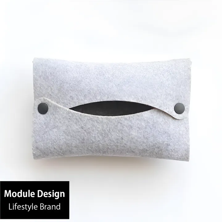 ポケットティッシュケースの新作〈ポケットティッシュケース2〉です。 新しい本体カラーとカラフルなスナップボタンが特徴で個性的なラインアップです。 1枚のフェルトを折りたたみスナップボタンでとめることによりフェルトの力でできたカタチです。手の中でふくらむような心地よいボリューム感です。ティッシュをセットし易く、取出し易い機能、そして清潔を保つようウォッシャブルフェルトを採用しています。 ○意匠登録 1483650