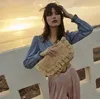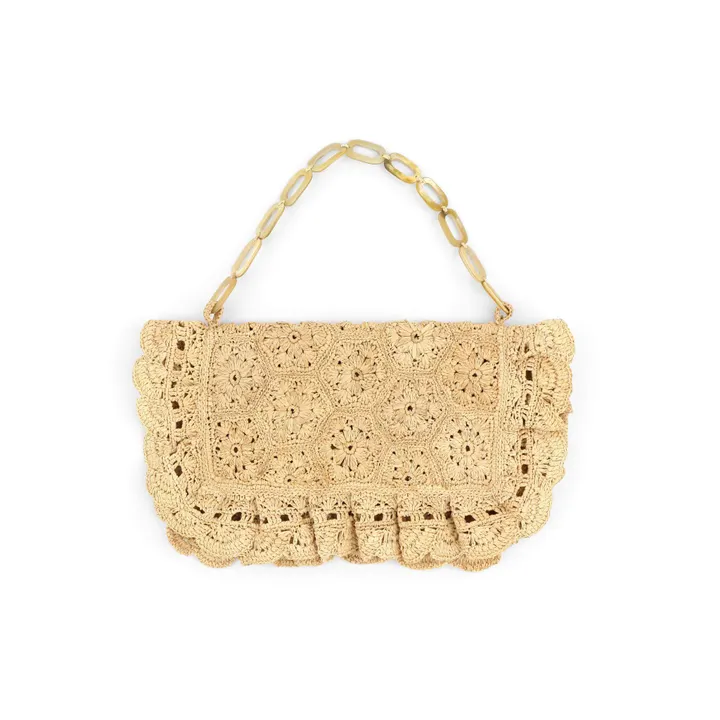 ☆繊細でロマンチックな天然繊維のクラッチバッグ☆ 美しい透かし編みで、端にはラフィアレースのフリルが施されています。 すべてハンドメイドで、花や美しい日々を連想させます。