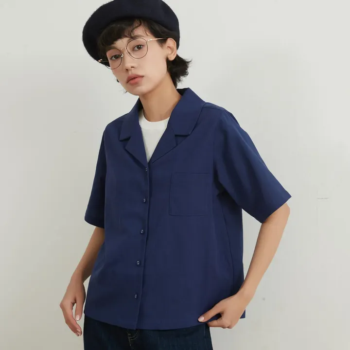 KNNC316リネンコットンキャンプカラー半袖ボタンシャツ NAVY/M