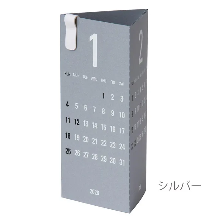 Re+g Triangular(リプラグ トライアングラー)は、三角に巻くことで、常に3ヶ月分の日付を確認できるカレンダーです。 特徴は、なんといってもコンパクトな形状。卓上のわずかなスペースに収まり、くるくる回すだけで、3ヶ月間を一度にチェックできてしまいます。 月ごとにミシン目が入っているので、過ぎた月は順に切り取ってください。 数字(暦)だけのシンプルなカレンダーだからこそ、視認性が高く、美しい仕上がりにこだわりたい。そのため、手間がかかる上に希少な”手刷り”のシルクスクリーン印刷を施しています。使用する紙も色味によってそれぞれに適した種類を選び抜いています。 クリップは100%紙でできた環境にやさしいペーパークリップを使用しています。 2026年の限定色は「セージ」。やわらかな淡いグリーンにうす紫の文字色で、ハーブを思わせる穏やかなカラーです。紙には緻密で温かい肌触りをもつ「NTラシャ」を使用しました。植物を飾るように、優しくお部屋に溶け込みます。 さらに今回は限定色「カカオ」も登場です!温かみのあるチョコレート色は、ナチュラルスタイルのお部屋にマッチします。 紙は「ポルカ」を使用。漉き込まれたカラフルなチリがアクセントになっています。