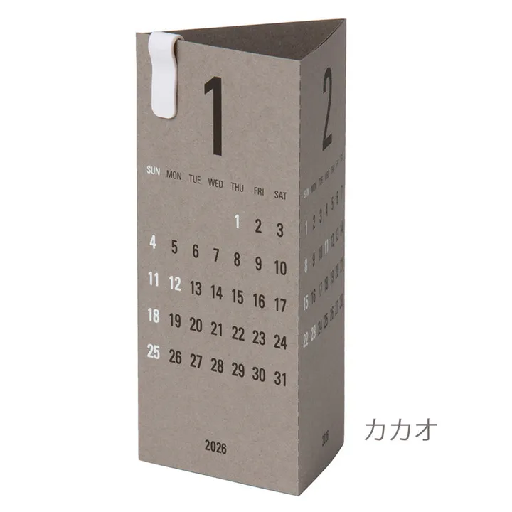 Re+g Triangular(リプラグ トライアングラー)は、三角に巻くことで、常に3ヶ月分の日付を確認できるカレンダーです。 特徴は、なんといってもコンパクトな形状。卓上のわずかなスペースに収まり、くるくる回すだけで、3ヶ月間を一度にチェックできてしまいます。 月ごとにミシン目が入っているので、過ぎた月は順に切り取ってください。 数字(暦)だけのシンプルなカレンダーだからこそ、視認性が高く、美しい仕上がりにこだわりたい。そのため、手間がかかる上に希少な”手刷り”のシルクスクリーン印刷を施しています。使用する紙も色味によってそれぞれに適した種類を選び抜いています。 クリップは100%紙でできた環境にやさしいペーパークリップを使用しています。 2026年の限定色は「セージ」。やわらかな淡いグリーンにうす紫の文字色で、ハーブを思わせる穏やかなカラーです。紙には緻密で温かい肌触りをもつ「NTラシャ」を使用しました。植物を飾るように、優しくお部屋に溶け込みます。 さらに今回は限定色「カカオ」も登場です!温かみのあるチョコレート色は、ナチュラルスタイルのお部屋にマッチします。 紙は「ポルカ」を使用。漉き込まれたカラフルなチリがアクセントになっています。