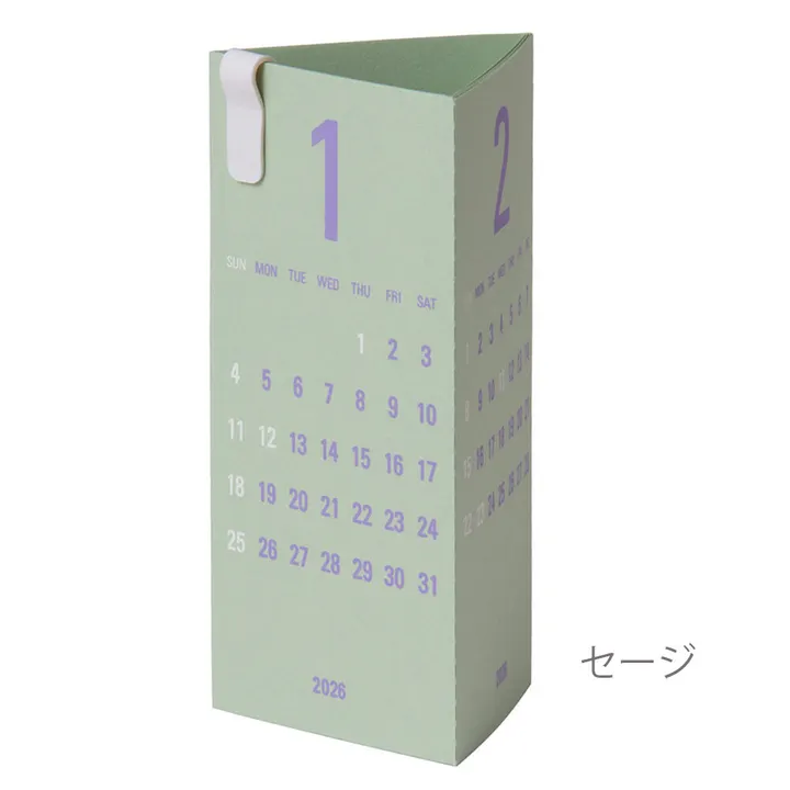 Re+g Triangular(リプラグ トライアングラー)は、三角に巻くことで、常に3ヶ月分の日付を確認できるカレンダーです。 特徴は、なんといってもコンパクトな形状。卓上のわずかなスペースに収まり、くるくる回すだけで、3ヶ月間を一度にチェックできてしまいます。 月ごとにミシン目が入っているので、過ぎた月は順に切り取ってください。 数字(暦)だけのシンプルなカレンダーだからこそ、視認性が高く、美しい仕上がりにこだわりたい。そのため、手間がかかる上に希少な”手刷り”のシルクスクリーン印刷を施しています。使用する紙も色味によってそれぞれに適した種類を選び抜いています。 クリップは100%紙でできた環境にやさしいペーパークリップを使用しています。 2026年の限定色は「セージ」。やわらかな淡いグリーンにうす紫の文字色で、ハーブを思わせる穏やかなカラーです。紙には緻密で温かい肌触りをもつ「NTラシャ」を使用しました。植物を飾るように、優しくお部屋に溶け込みます。 さらに今回は限定色「カカオ」も登場です!温かみのあるチョコレート色は、ナチュラルスタイルのお部屋にマッチします。 紙は「ポルカ」を使用。漉き込まれたカラフルなチリがアクセントになっています。