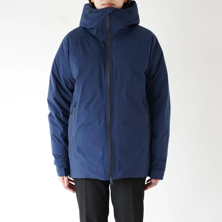 シンプルなデザインで防水性と機能性にこだわった超軽量防水ダウンジャケット。 本格アウトドア用に匹敵する耐水圧と透湿性を備えた素材を防水ダウン用に新たに開発した「BARRIER EFFECT. LIGHT」によって水分含浸を防ぎつつ、衣服内の蒸れを素早く解消。 ファスナーにはYKK社製の簡易防水ファスナーを使用し体やポケットへの水の侵入を防ぐ。フロントファスナーは上下どちらからでも開閉することができ便利。 使用しているダウンは世界有数のダウンサプライヤーALLIED社 750FP WHITE DOCK DOWNを使用し保温性にも優れている。 フード、袖口、裾口はストッパーやベルクロで調節が可能となっており雨風の侵入を防ぐことが可能。 両サイドのポケットはハンドウォーマーになっておりポケットの中で手を温めることが可能。また左胸内側にもポケットがあり携帯電話などの収納が可能。