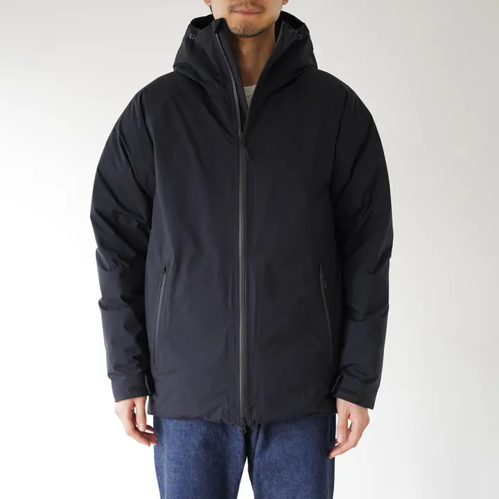 シンプルなデザインで防水性と機能性にこだわった超軽量防水ダウンジャケット。 本格アウトドア用に匹敵する耐水圧と透湿性を備えた素材を防水ダウン用に新たに開発した「BARRIER EFFECT. LIGHT」によって水分含浸を防ぎつつ、衣服内の蒸れを素早く解消。 ファスナーにはYKK社製の簡易防水ファスナーを使用し体やポケットへの水の侵入を防ぐ。フロントファスナーは上下どちらからでも開閉することができ便利。 使用しているダウンは世界有数のダウンサプライヤーALLIED社 750FP WHITE DOCK DOWNを使用し保温性にも優れている。 フード、袖口、裾口はストッパーやベルクロで調節が可能となっており雨風の侵入を防ぐことが可能。 両サイドのポケットはハンドウォーマーになっておりポケットの中で手を温めることが可能。また左胸内側にもポケットがあり携帯電話などの収納が可能。