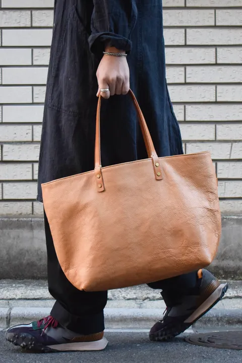 minca Tote bag 06 L / Handle Mバージョン ― 日常に寄り添う、上質レザートート ミンカの人気シリーズ「Tote bag 06」のLサイズに、肩掛け対応のHandle Mを組み合わせたバージョン。 収納力と使い心地を両立した横型フォルムは、13インチPCや書類、毎日の必需品をスマートに持ち運ぶのに最適です。 本体には、栃木レザー製シュリンクレザーを使用。軽くしなやかで、使い込むほどに手に馴染み、美しい艶と風合いを育てます。 ハンドルにはハーネスレザーを採用し、厚手のコートの上からでも自然に肩掛けできる絶妙な長さに設計されています。 真鍮製リベットで本体とハンドルをしっかりと固定。耐久性と気品あるアクセントを兼ね備え、日々のスタイルをさりげなく引き立てます。 ・PCや書類もすっきり収まるLサイズの収納力 ・肩掛けできるMサイズハンドルで快適な持ち運び ・軽やかで柔らかい栃木レザー製シュリンクレザー使用 ・真鍮リベットの上品なディテール ・通勤、通学、休日の外出まで幅広く活躍