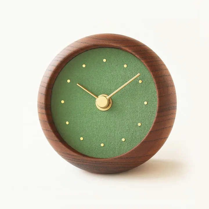 文字盤にグリーンジャスパーを砕いた粉末(岩絵具)を塗りました。 普通の絵具では出せない透明感のあるやさしい色彩とザラザラした岩絵具特有の質感をお楽しみ下さい。 本体は、漆器の産地として400年以上の歴史を持つ石川県加賀山中の「ろくろ引き」という、回転する木に鉋(カンナ)を当てて形作る方法で製作しました。 素材はケヤキで、木目が美しく、なめらかでしっとりとした質感です。 文字盤は、下地に金沢市二俣町で和紙作りをされている、石川まゆみさんに漉いていただいた和紙を使用し、 その上に天然石を砕いて作られる「岩絵具」を幾重にも塗り重ねています。インデックスは金沢の金箔です。 ■木の部分の色は、プレーン・ブラウン・ブラックの三色をご用意しております。 ■裏面カバーにオリジナルの刻印を入れることができます。(有料 +880円税込) ■受注生産のため、基本的にご注文いただいてから約2週間のお時間をいただきます。ご了承ください。 【時計部分の仕様】 ・日本製・1年保証・本体のサイズ:直径10cm厚さ5.4cm・使用電池:単3形乾電池 【付属品】 ・単3乾電池1個・取扱説明書1部・牛革製裏面カバー