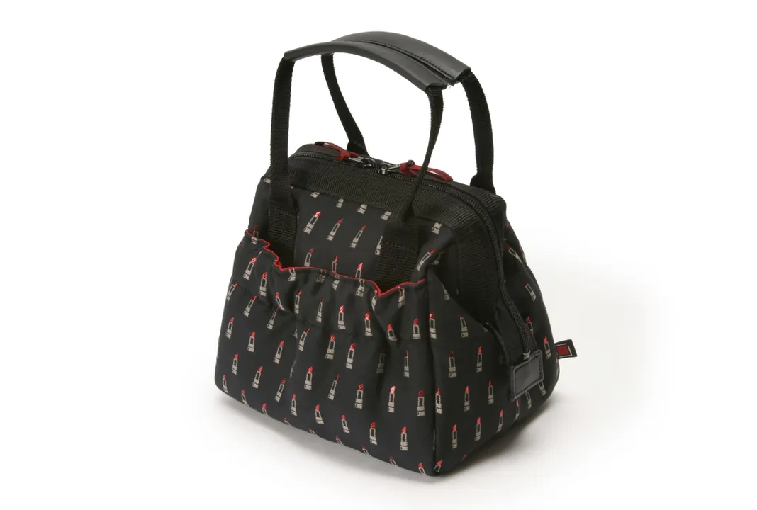 ブラックカラーの上に輝く、メタリックなラメ糸で織られた真紅のリップスティックとパイピングのゴールドカラーのアクセントが、何とも言えない大人可愛いデザインです。 中をのぞけば、四方にポケットが。全面タイプが2つと、太いホルダーと細いホルダーがそれぞれ4つ。アイテムごとに細かな収納ができます。メイクボックスとしてはもちろん、ハンドバッグとして普段使いをしても。バッグ内には四方にポケットがあるので、メイク道具と日用品との入れ分けも可能です。