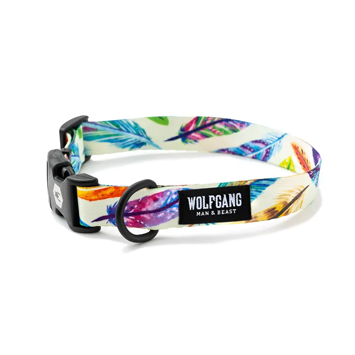 犬用の首輪。 WOLFGANG MAN & BEAST のリードやカラー(首輪)は、車のシートベルトなどにも使われる、強度と柔らかさ、耐久性を兼ね備えたポリエステル100%のウェビング素材を使用しています。 水を吸い込まない、極細のポリエステル糸を非常に密に編むことによって、海や川でも使用可能、汚れや臭いもつきにくい特徴があります。 さらに、ウォッシャブルで洗濯も可能。 アウトドアでの使用にもピッタリです。 製法には、ウェルディング製法( 生地を熱で溶かすことによって生地同士を接着し、強い耐久性を実現する溶着製法 )を採用。 糸による縫い目が無いので、飼い主・愛犬にとって快適な使い心地を実現。通常の縫製による擦れからの糸のほつれが生じることがありません。   WOLFGANG MAN & BEAST のすべてのドッグプロダクトは、こだわりのアメリカンメイド。 ドッグプロダクトは、大切なパートナーである愛犬が、長年愛用できるものであってほしい。 その思いから、選び抜かれた素材を使い、品質にこだわり、WOLFGANG MAN & BEASTのすべてのドッグプロダクトはアメリカ国内で生産されています。 【FeatherFriend- フェザードフレンド -】 カラフルなフェザーが印象的なアートワーク。 この美しいキットを身につければ、ドギーファッションの第一人者としての地位は揺るぎないでしょう。 <Sサイズ:対応犬種の目安> ジャック・ラッセル・テリア/パピヨン/マルチーズ/シーズー/ヨークシャーテリア/キャバリア/ホワイト・テリア/ミニチュア・ダックス ...etc <Mサイズ:対応犬種の目安> パグ/コッカスパニエル/シュナウザー/ボストンテリア/フレンチブルドッグ/オーストラリアン・キャトル・ドッグ/スタッフォードシャー・ブル・テリア/ブリタニー/サルーキ/ビーグル/柴犬/ダルメシアン/ウェルシュ・コーギー/ボーダー・コリー ...etc <Lサイズ:対応犬種の目安> ボクサー/ゴールデンレトリバー/ジャーマン・シェパード/ロットワイラー/シベリアン・ハスキー/ブルドッグ/コリー/アメリカン・ピットブル・テリア ...etc 上記の犬種はあくまで目安です。個体によりサイズは変わりますので、購入前に必ず愛犬の実際のサイズを計測して適合サイズを確認してください。