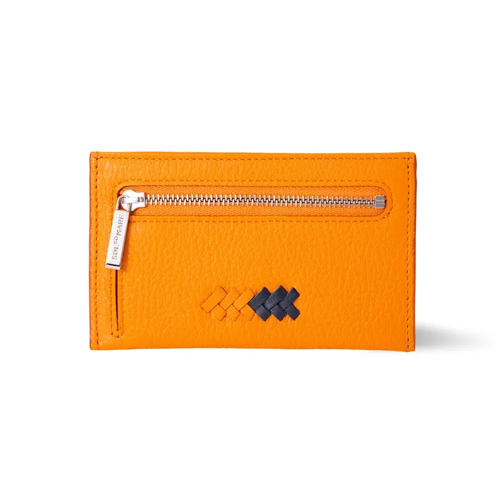 ーーーふんわりと優しい手触りのスマート財布 太陽に照らされた浅瀬の水面の反射を表現したモチーフがアクセントのスリムでコンパクトなスマート財布。ユニセックスなデザインなので、性別や年代を問わずお使いいただけます。 ーーーお財布の機能について 見やすく取り出しやすいマチ付きのコインポケットとオープンポケット1つ、カードが4枚収納でフリーポケットを1つ装備。オープンポケットにはお札を折り曲げて入れられ、コンパクトながらも収納力抜群です。 ーーー素材について 軽く優しい手触りのソフトシュリンク革を使用。シュリンク加工されているレザーの特徴として、傷が目立ちにくく扱いやすいというメリットがあります。経年変化は比較的にゆっくりなので、綺麗な状態で長くお使いいただけます。 引手にSOLSOMAREのロゴが入ったブランドオリジナル仕様のファスナーはYKKエクセラファスナーを使用しているので、動きも滑らか。 ーーーブランドBOX入りでギフトにも最適 いつも頑張っている自分へのご褒美として、または大切な方への贈り物としても。 商品は一つ一つブランドBOXにお入れいたします。 ーーアイテム詳細 [サイズ] H:81 W:132 D:3 [機能] カード×4 オープンポケット×1 コインポケット×1  ファスナー×1(YKKエクセラファスナー) [カラー] オレンジ/ネイビーブルー ※掲載商品の色味は出来る限り実物の色味に近づけておりますが、ご利用のパソコン、スマートフォン、モニター環境によって、画像の色味が異なって見える場合がございます。予めご了承下さいませ。 [素材] 国産牛革ソフトシュリンク/レーヨン