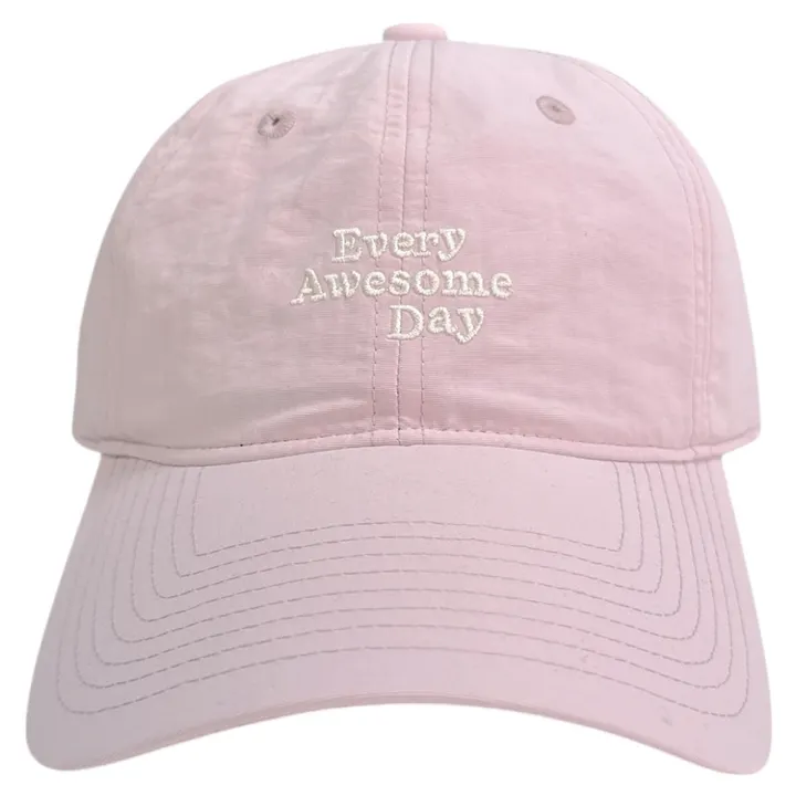 撥水加工が施されたナイロン素材。ほどよいシワ感がかぶり心地をUP。フロントには"毎日が素晴らしい日"の刺繍入り。