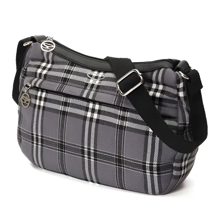 チェック柄のショルダーバッグです♪シンプルな衣装でも華やかな印象になります!開口タイプ/ファスナー式 ■ポケット/(内側)ファスナー×1、オープン×2(外側)前ファスナー×1