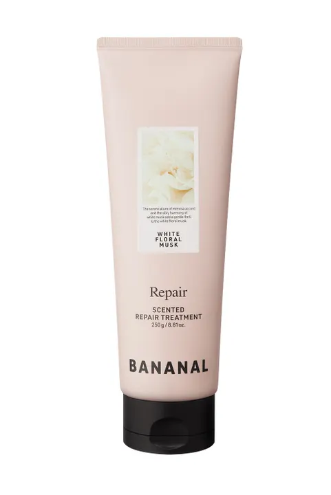 BANANAL Scented Repair treatment ( Baby Musk / White Floral Musk ) こだわりのタンパク質ケア 傷んだ頭皮&ヘアケア 14種の様々な植物性成分&植物性オイル配合でしっとりと保湿 タンパク質含有量900%UP ※1 頻繁に行うヘアカラーやパーマ、毎日使用するドライヤーや強い紫外線など 日常の様々な刺激が原因で傷んだ髪はキューティクルが損傷し、タンパク質を損失します。 BANANALは髪を構成するタンパク質成分にこだわりました。 ※1 既存のBANANALパフュームドヘアシャンプーに含まれるタンパク質成分含有量に 対しての基準 高濃度クリームバームタイプのテクスチャーで 傷んだ髪に素早く浸透しなめらかな髪へとケアします。 BANANAL センティッドリペアライン タンパク質COMPLEXで奥深くまでしっかりとケア 感度の高い香りで一日の始まりから終わりまで包み込む