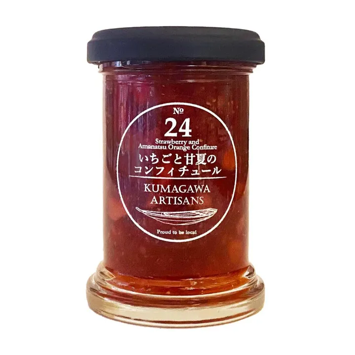 球磨川の源流に近い熊本県水上村湯山地区で育った熊本県のいちご「ゆうべに」は鮮やかな紅色と濃い味わいが特徴です。とびきりおいしいこのいちごに取り合わせたのは、同じく熊本県の豊かな海、不知火(しらぬい)海の海風を受けて育った甘夏。その香り高いピールを手作業で細く刻んで香りづけに加えました。さらにバルサミコ酢で酸味の奥深さをプラスしたコンフィチュールはジャムのようなマーマレードのような、お口に入れた瞬間から後味まで優しく、ノスタルジックでありながら複雑な楽しい味覚が続きます。まずはシンプルにバタートーストがおすすめです。