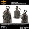 アメリカ製ガーディアンベル社製ガーディアンベルです。 MADE IN USA アメリカ製 交通安全 魔除け 御守り ガーディアンベル アメリカのライダーの間には、事故や、転倒の原因は「道路にひそむ悪魔」によるいたずらだという伝説があります。悪魔は走る者に悪戯やトラブルを運んできます。このベルは美しい音色で悪魔たちを追い払うと言われ愛されています。そんな悪魔のいたずらを防ぎ、御守りとなるのが、守護者のベルという意味を持つガーディアンベル。 日本でも鈴の音(ね)は神道では魔除けの音と言われています。ピューター製の鈴でいい音色でガーディアンベルはデザインも様々あります。 またガーディアンベルにまつわる伝説として、プレゼントとして送られたベルの効果は、自分で手に入れたものの2倍になると言われています。 それゆえに彼氏・彼女・友達・家族へのプレゼントとしての人気も非常に高まっています。 シルバーアクセサリーのようにおしゃれに装着できて素敵な音色を奏でるガーディアンベル。 バイカー以外にも自転車や旅・交通安全のお守りとしてお使いいただけます。 カバン・ランドセル・キーホルダー・ペットの首輪等に付けてお使いください!! ※タイラップ等でバイクのフレームにも簡単に取り付けできます。 アメリカンモデルだけではなく、旧車ファン、レプリカライダーまで、さらにバイクだけでなく、自転車や車にもピッタリな御守りとなっています。 アクセサリーとしても人気で、アイディア次第で車体だけでなく、キーホルダーや鞄など、どこにでも付けておしゃれに楽しめます。