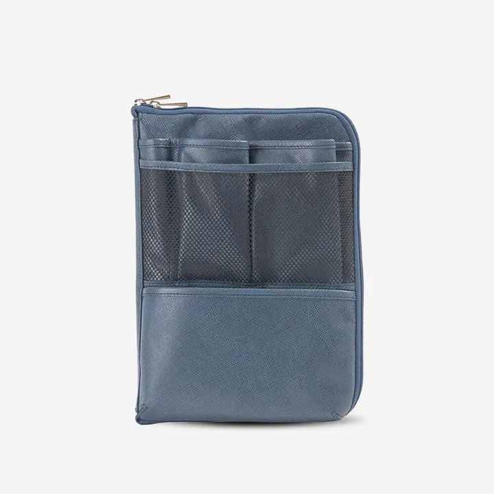 サフィアーノレザーを使用したビジネスリュック愛用者のための縦型のバッグインバッグ。仕事道具をきれいに整理整頓でき、ペン差し、小物ポケット、メッシュポケットと異なる収納機能が充実。メイン収納には13インチのノートパソコンやA4サイズの書類が収納できる。またダブルファスナーの為、コの字に開き物の出し入れが非常にスムーズ。同素材で作られたリュック(GA608)とセットご使用いただけます。