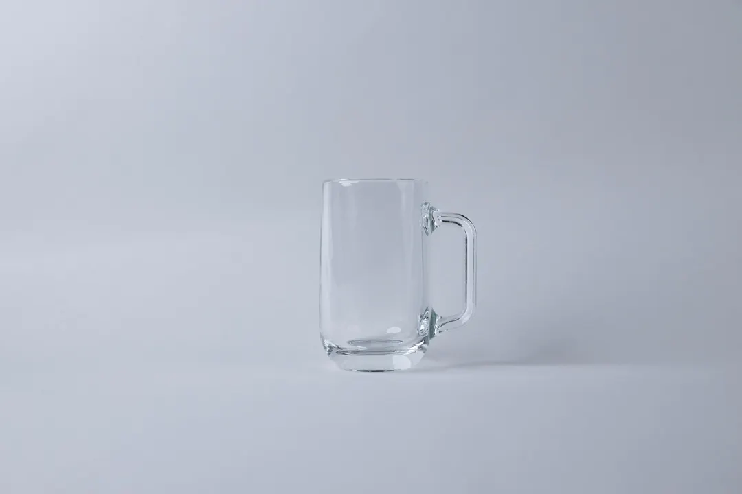 ガラスの厚み感をストレートに感じられるクリアは、色も泡も氷も綺麗にキリリと映える爽快感が持ち味。350mlビール缶が注ぎ切れるサイズに計算して作っています。さらに高さを抑え、太めの設計で、食器棚に収まりますく、洗いやすい。